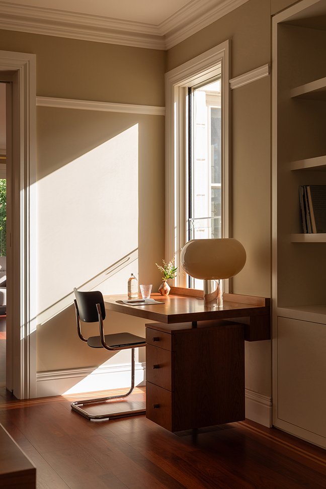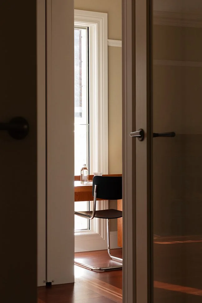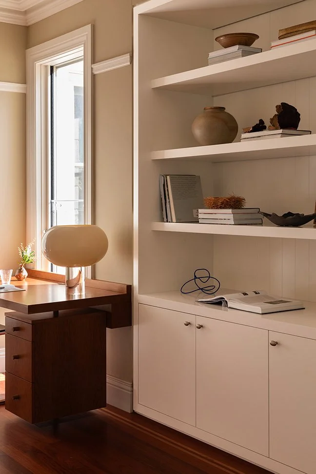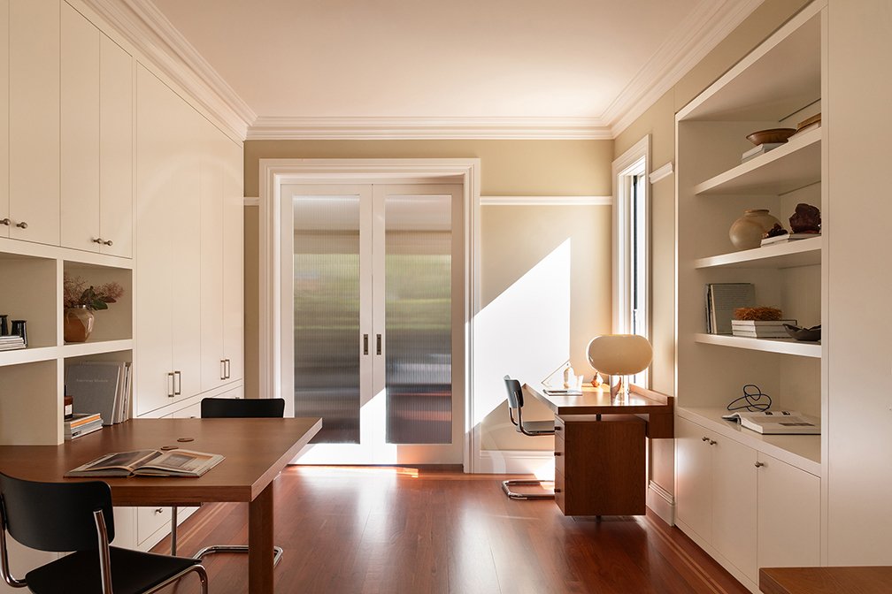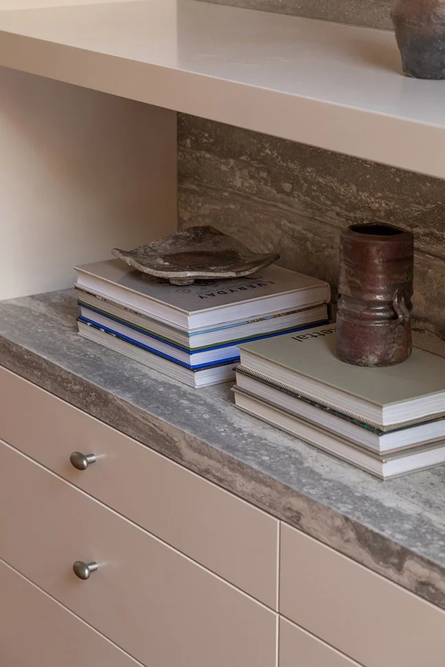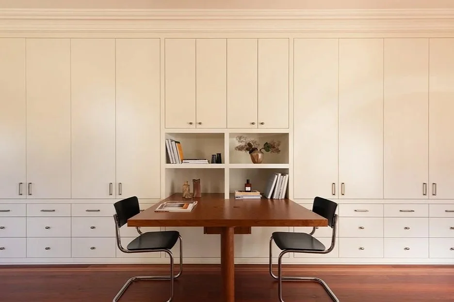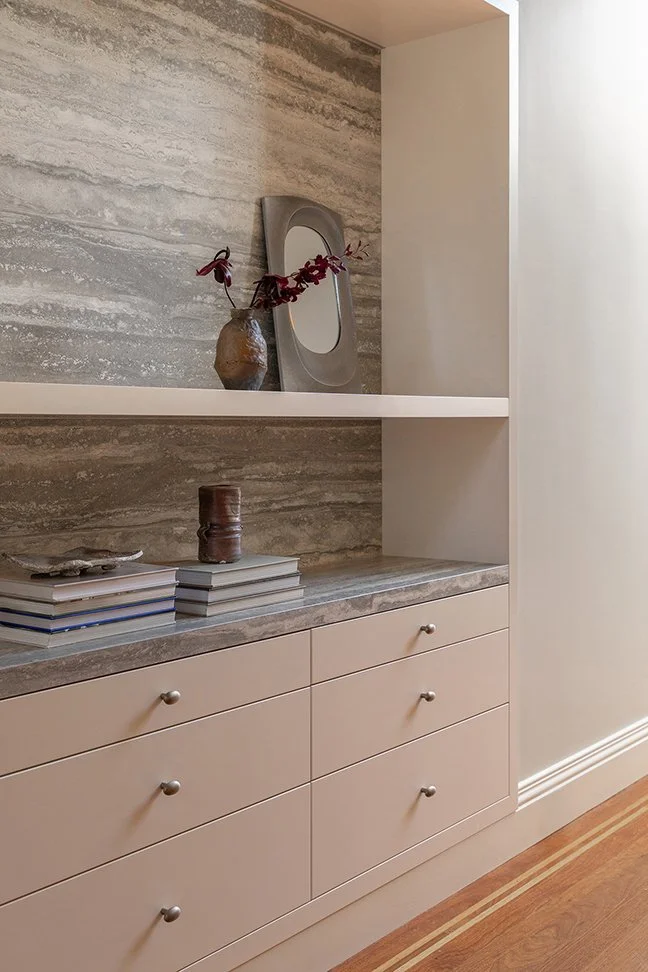 In the leafy suburb of Killara, we were engaged to design a family study for our client’s four children, providing generous storage alongside dedicated work and display areas. Textured glass was introduced to draw additional natural light into the space. By reconfiguring the layout and closing an existing doorway, we were able to transform a blank wall in the entry hallway into a practical key and bag drop-off zone. The resulting space, combining cherry veneer, impressive natural stone, off-white joinery and taupe-coloured walls, delivers a strong yet understated balance of functionality and refined aesthetics.